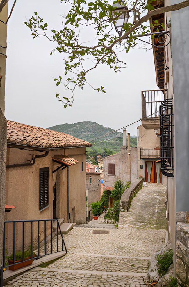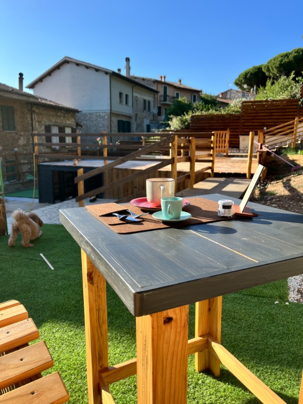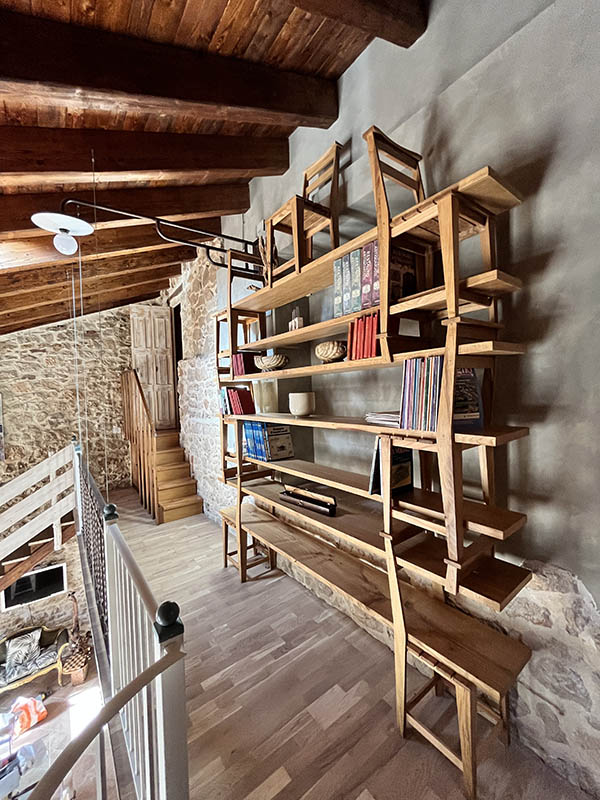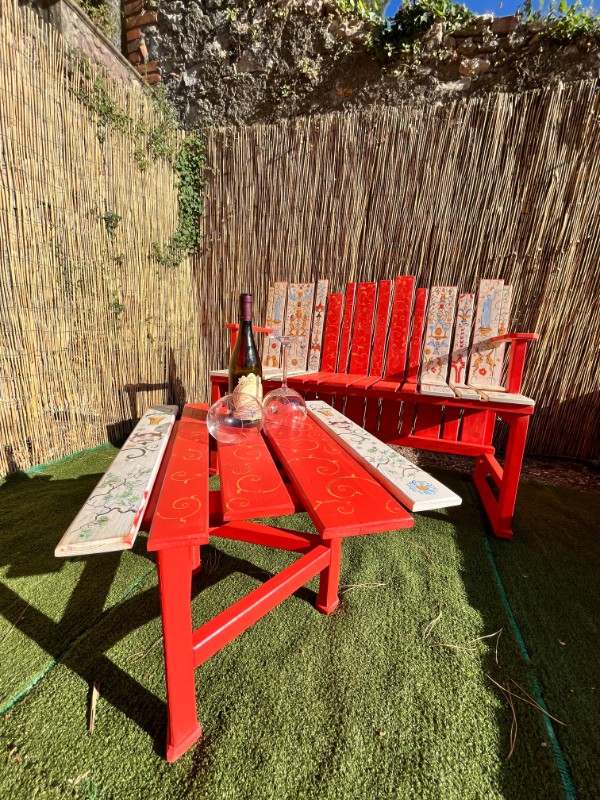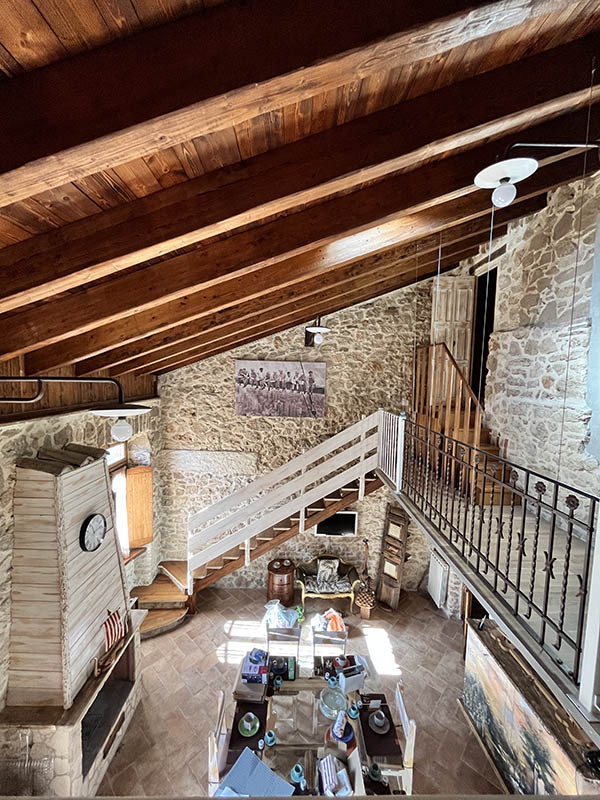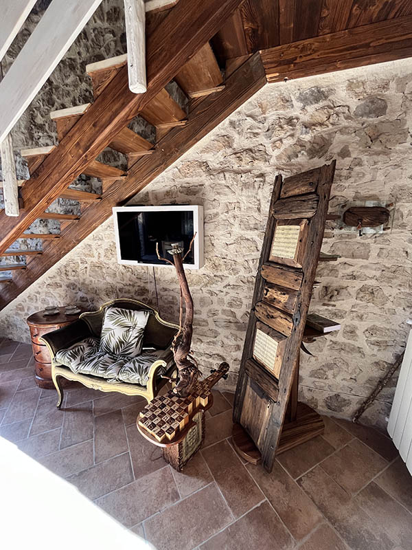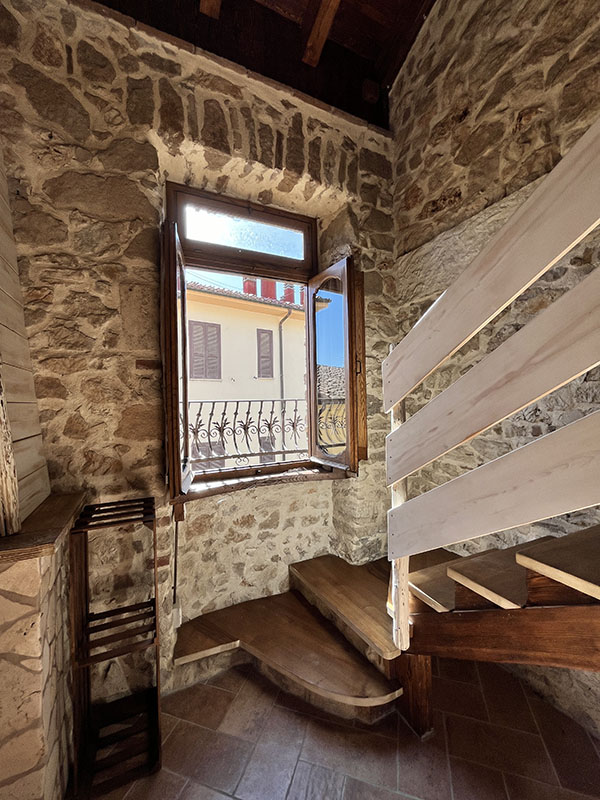 L’appartamento Sottobacco si distingue per il suo design rustico ed elegante, con pareti in pietra a vista e soffitti in legno che creano un’atmosfera calda e accogliente. Il piano principale include un’area pranzo con un tavolo in vetro e un camino che emana fascino. Un soppalco con ringhiere in ferro battuto offre uno spazio perfetto per la lettura o il relax. Il soggiorno, con un vivace divano rosso, crea un affascinante contrasto con i toni naturali, mentre le finestre offrono una vista pittoresca sui tetti del borgo, aggiungendo ulteriore charme.