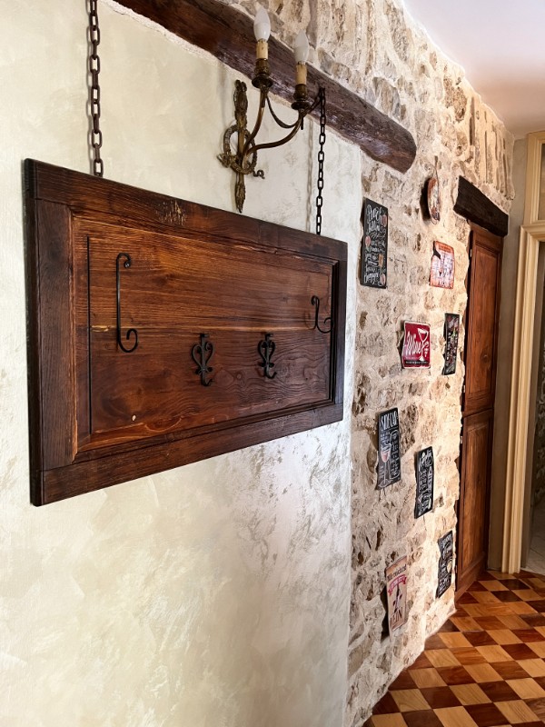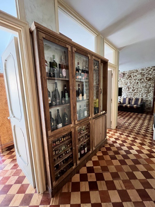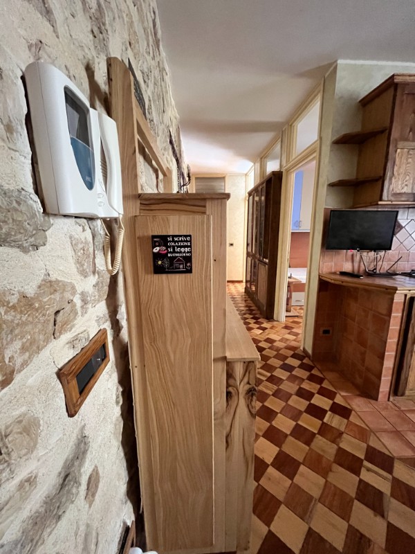 L’appartamento di 65 mq offre un’eleganza rustica e accogliente. La cucina è caratterizzata da mobili in legno massello e un piano di lavoro piastrellato, completo di forno e piano cottura. La zona pranzo, luminosa grazie a un’ampia finestra, è arredata con un tavolo in legno artigianale. Il corridoio impreziosito da una credenza in legno con ante in vetro, espone una collezione di liquori mignon, che conduce armoniosamente alle altre stanze. Il pavimento, con il suo motivo a scacchiera, unifica gli ambienti creando un’atmosfera calda e sofisticata.